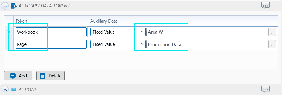 Values assigned to Workbook and page auxiliary data tokens: