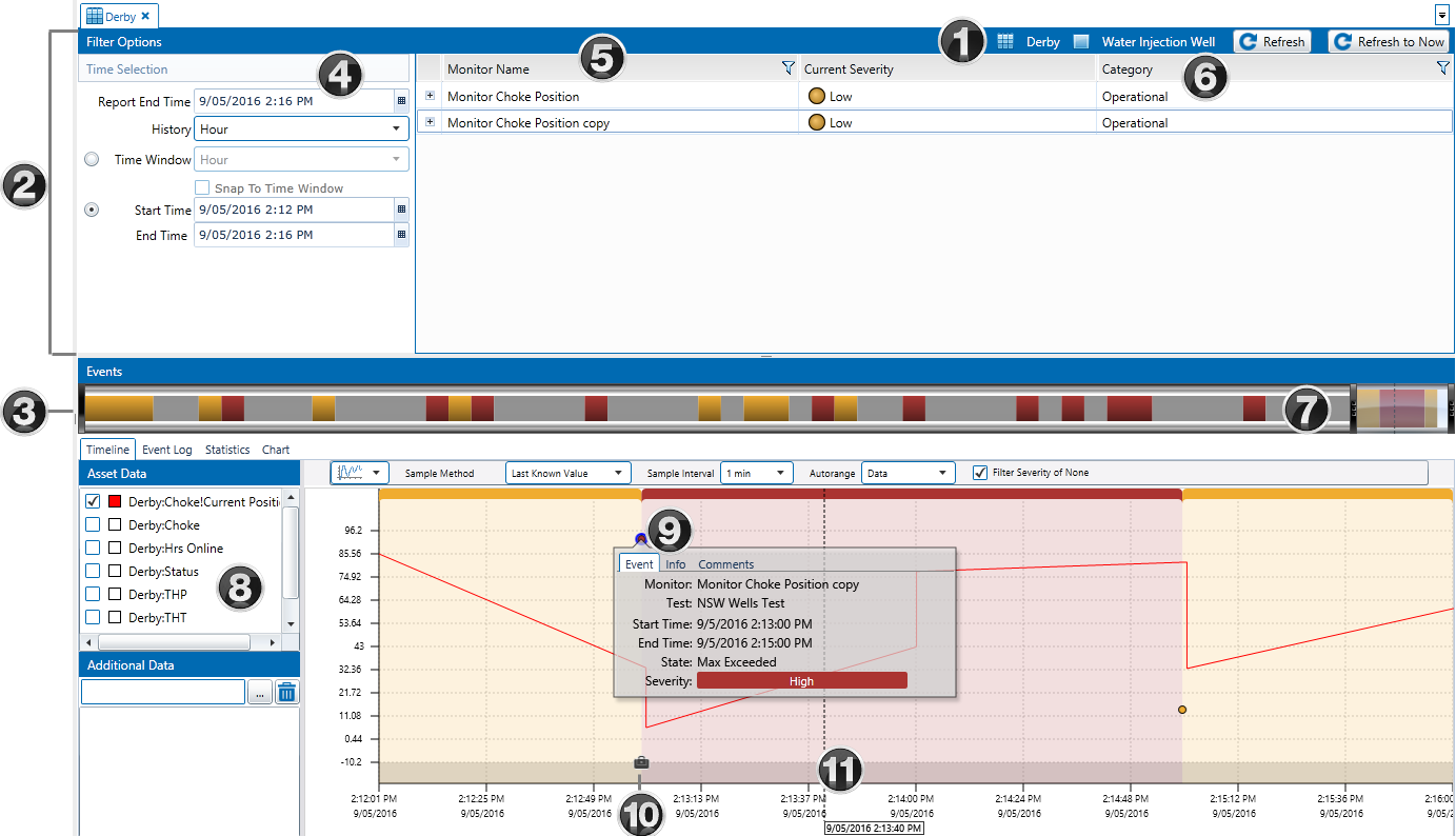 | Events | A summary representation of the report events, for the History period. Each colour band represents a change in the maximum severity of all events (within the filtered group) over that portion of time. | |