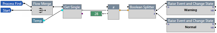 In the following example, the ≠ component checks to see if the temperature is not equal to 28. If it is, an event is raised and the state of the entity changes to Warning. Otherwise, an event is raised and the state of the entity changes to Normal.
