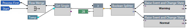 In the following example, the ≥ component checks to see if the temperature is greater than or equal to 28. If it is, an event is raised and the state of the entity changes to Warning. Otherwise, an event is raised and the state of the entity changes to Normal.