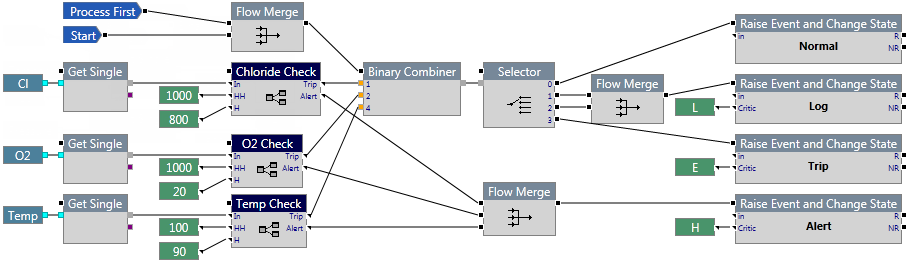 In the following example, the results of the chloride, oxygen, and temperature checks are combined in the Binary Combiner and the resulting output is sent to a Selector. The Selector component directs the output to another component, which determines if the output is to be logged or if an error is to be thrown.