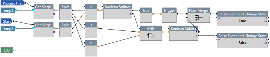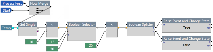 In the following example, if the temperature is less than 10, the Boolean Selector outputs a value of 12. This value is then checked to see if it is less than 25, and an event is raised accordingly.