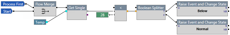In the following example, the < component checks to see if the temperature is less than 28. If it is, an event is raised and the state of the entity changes to Below. Otherwise, an event is raised and the state of the entity changes to Normal.
