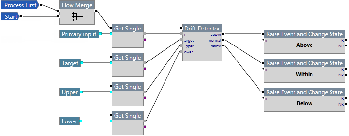 The Drift Detector component supplies the logic for detecting the deviation between process data inputs and reference inputs. The reference inputs can be a fixed value, or it can be a dynamic value from another data stream.