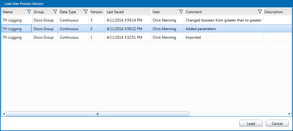 In the Load User Process Version screen, click the version you want to open, and then click Load.