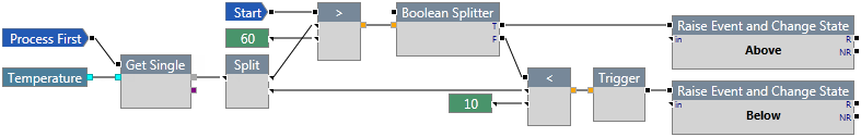 This process compares an input value to see if it is higher than 60 or lower than 10. If the value is higher than 60, an event is triggered and the state of the entity is changed. If the value is lower than 10, a different event is triggered and the state of the entity is also changed.
