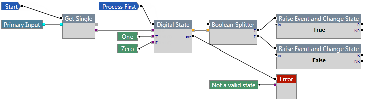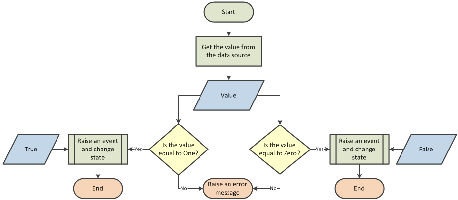 This process compares an input value to see if it is equal to Zero or One. If the value is equal to Zero, an event is raised and the state of the entity changes to False. If the value is equal to One, an event is raised and the state of the entity changes to True. If the value does not equal either Zero or One, an error message is raised.