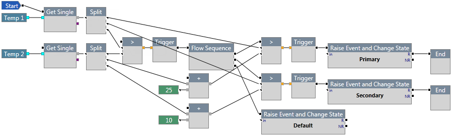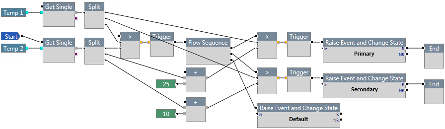 6. The Boolean operator then makes the comparison. Since Temp 1 (9) is not greater than Temp 2 (25), nothing happens. The process now ends because there is no further path to follow — the Flow Sequence component is missed because the Boolean operator does not flow backwards.