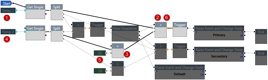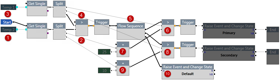 1. The value for Temp 2 is retrieved first and is sent to the first output pin to a > Boolean operator.