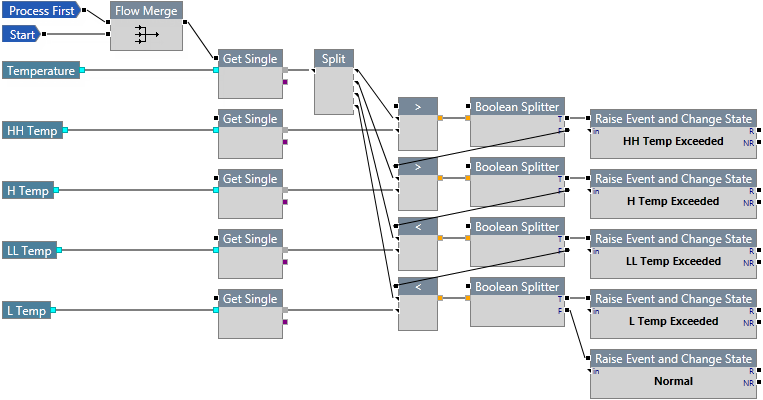 The Alarm process tests continuous data (Temperature) against high limits (H and HH) and low limits (L and LL).