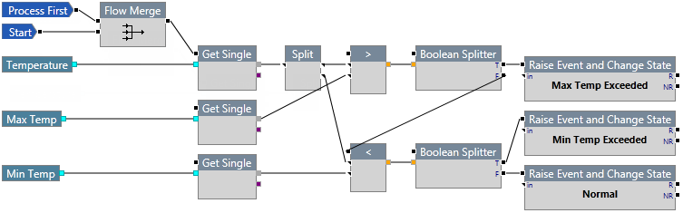 The Min Max process tests continuous data (supplied by the Temperature input) against a maximum limit (Max Temp) and a minimum limit (Min Temp).
