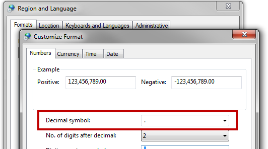 Cause: A likely cause is that the Windows format for the decimal symbol is incorrect; for example, it may be set to a comma (,) instead of a point (.).