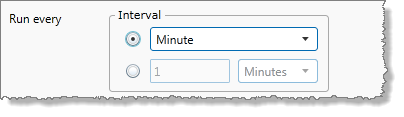 - Select the first option button in the Interval box, and then select an interval from the corresponding Interval drop-down list. This could be a minute, 5 minutes, an hour, a week, and so on, and indicates that the trigger should run every single minute, 5 minute interval, hourly interval, and so on.
