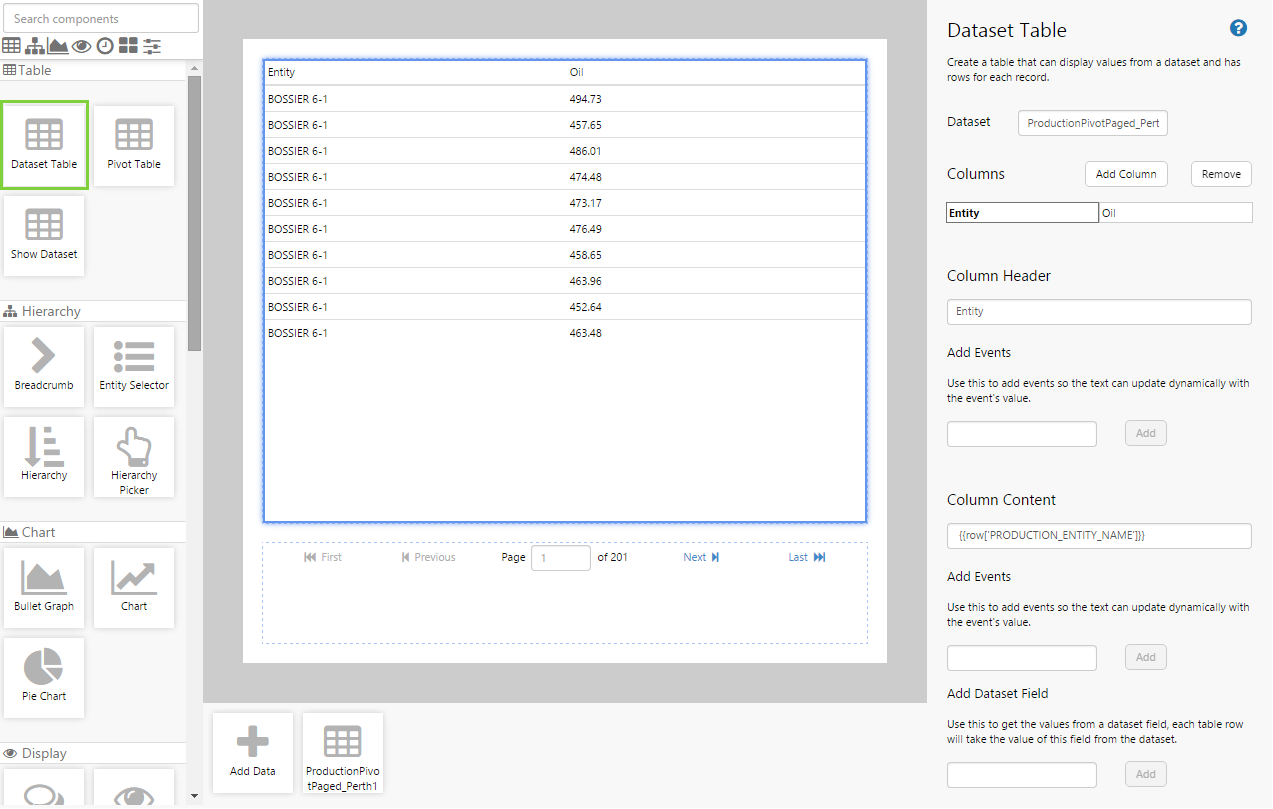 Drag and drop a Dataset Table onto the page and configure it as follows: