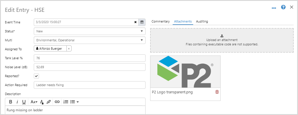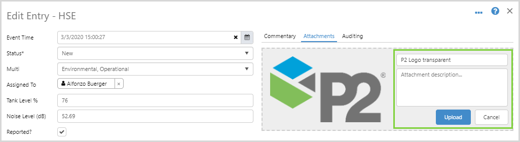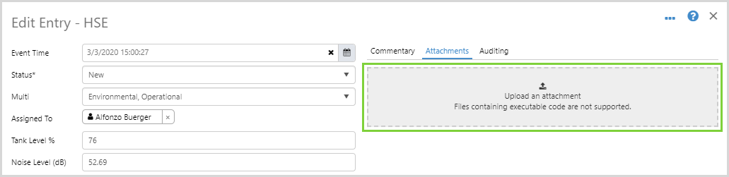 You can attach photos and documents to an entry. Note that an entry must first be saved before you can add attachments, and only certain file types are allowed.