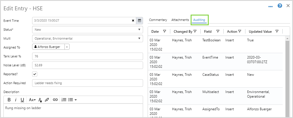 Every time a change is made to an entry, the system will keep a record of what has changed. You can see these changes in the History section on the right hand side of the entry.