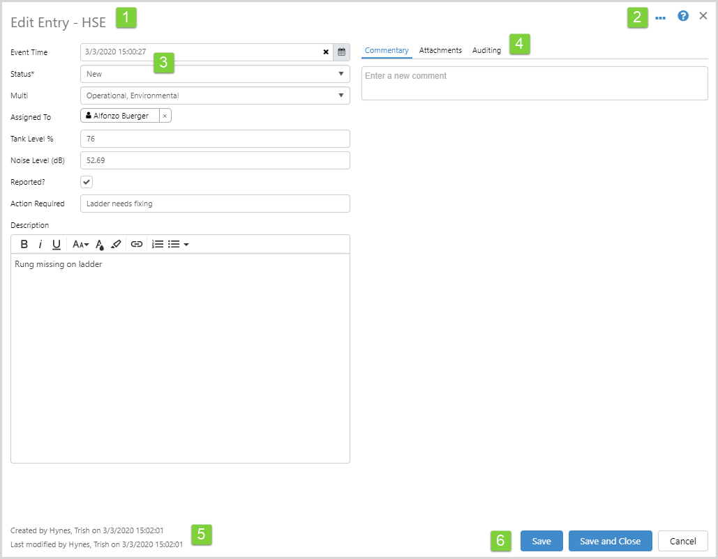1 The title of the form - this shows if you are adding or editing and entry, and the log you are adding it to.
