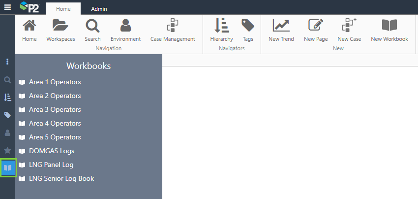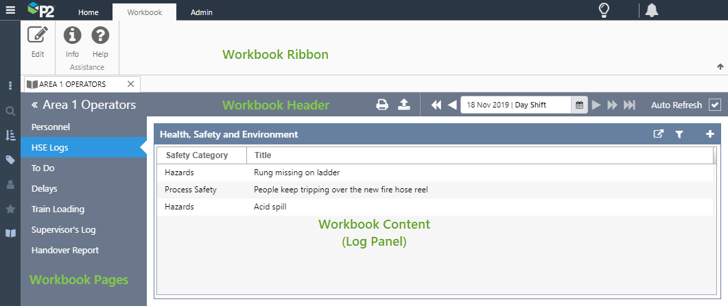 Workbooks have a distinct Look and feel, with a dark blue header and page list on the left. The workbook header contains the main functions specific to the workbook and shift, such as the Shift Navigator, Publishing, and Report Printing functions. Additional functions that apply to the workbook are contained in the workbook ribbon.