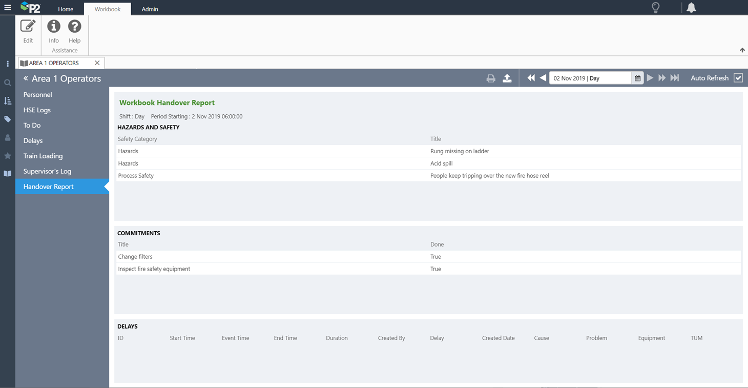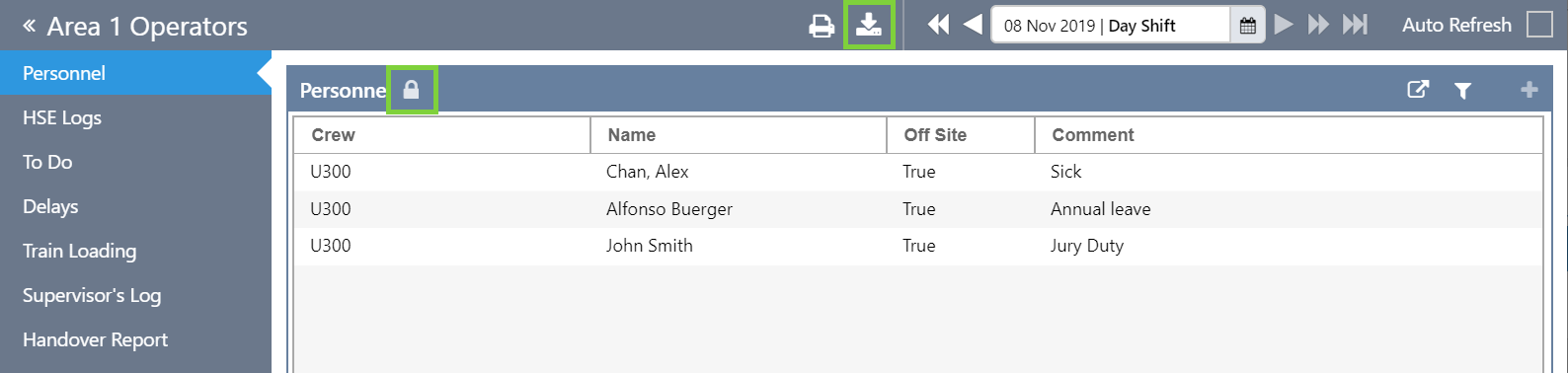 At the end of a shift, the shift can be locked down to prevent further editing, and a Handover Report can be printed.