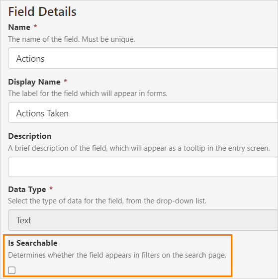 The ‘Is Searchable’ field configuration option, allows users to specify whether a field will be searched when an Entry search is performed in Explorer. In addition, only ‘Is Searchable’ fields can be selected in the ‘Sort Results By:’ and ‘Filter Results By:’ options of the search function.