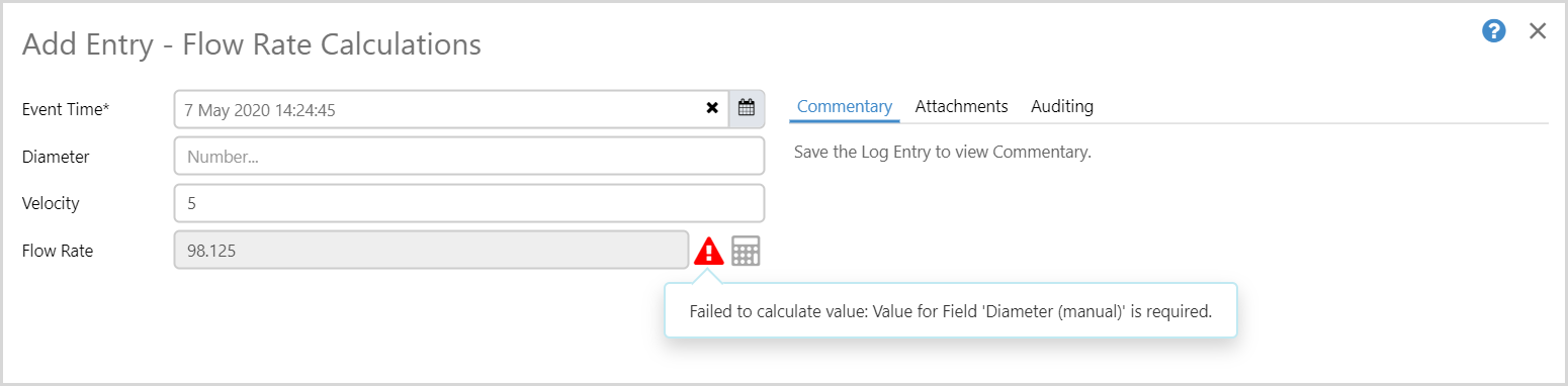 If the calculation field encounters an error, an error icon is displayed next to the field, which you can click to see the error message.