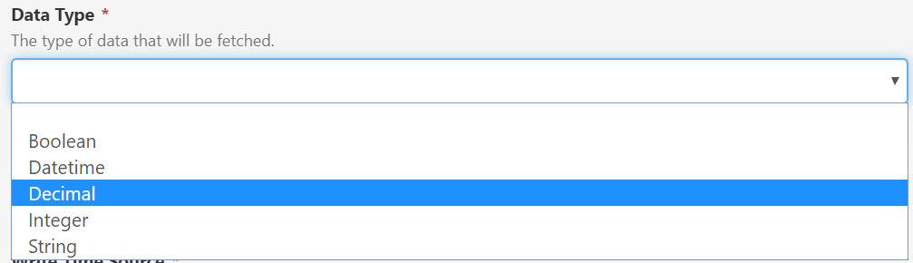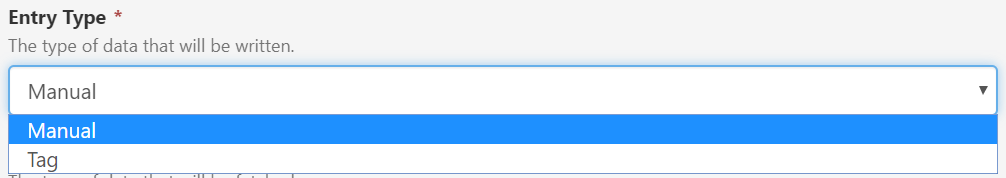 Regardless of whether it is a manual or tag entry type, the type of data that will be fetched an written can be either: Boolean, Datetime, Decimal, Integer, or String.