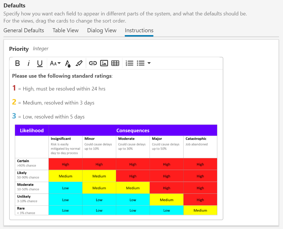 In Shift Log Forms, there is a new tab called ‘Instructions’ in the Defaults section. For each field, a text box with a formatting toolbar is available, where you can create instructions for each field.