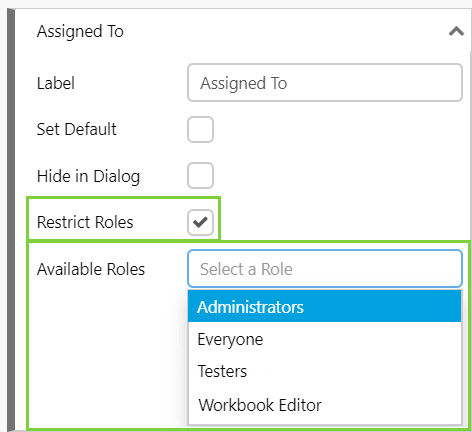 When configuring a workbook, user fields, such as ‘Assigned To’, can now be configured to only show users that belong to a specified role. These roles are defined in the Security section of Server Management.