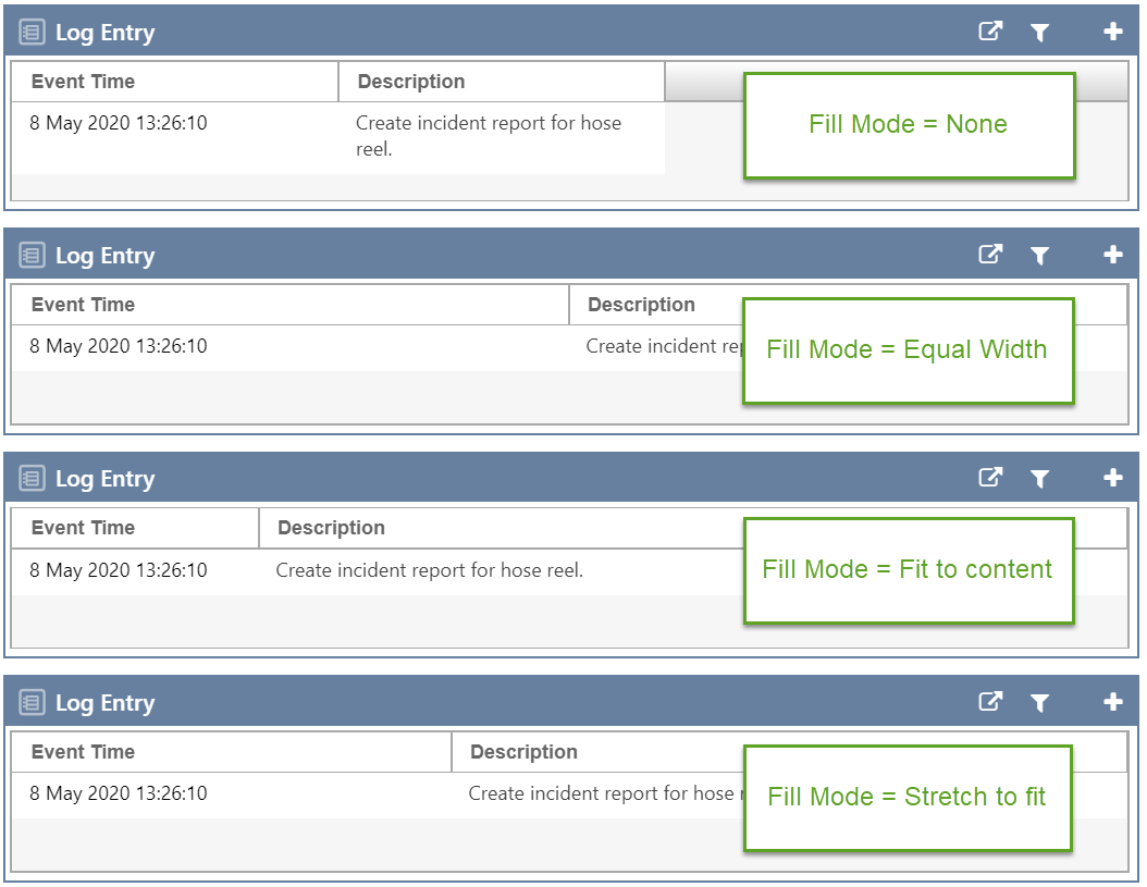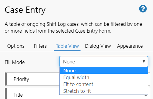 Fill Mode allows you to specify how the columns will be distributed across the width of the table, if a width has not otherwise been specified for a field. All fill modes except None will re-calculate the width of the columns whenever the window is resized or the column order is changed.