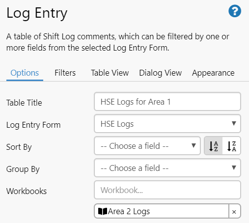 During workbook configuration, Log Entry components now have an additional ‘Workbooks’ field on the Options tab. This allows you to specify one or more workbooks from which the log entries will also appear in this workbook.