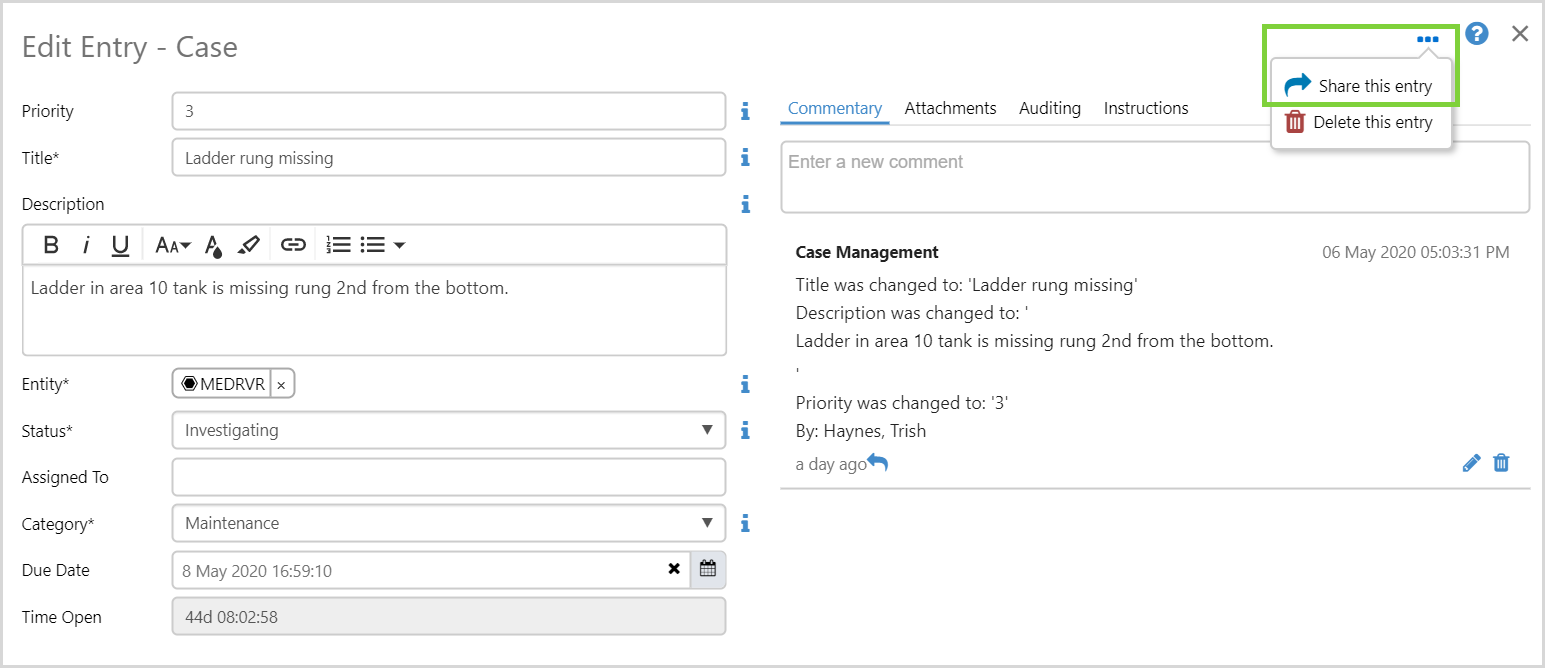 It is now also possible to share specific entries to another workbook. The receiving workbook must contain entries of the same type (i.e. log entry to log entry, case entry to case entry).