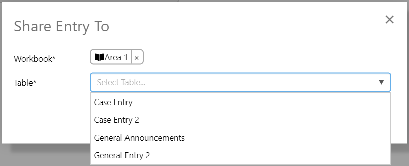 You will then be promoted to select the workbook you want to share to, and you will also need to specify the table in which to share the entry. Note that tables that use the same form as the originating entry will not be listed, as entries are automatically shared between forms.