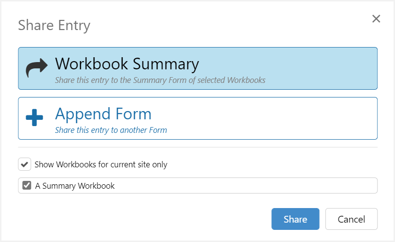 The Share Entry dialog has been updated to provide the additional Workbook Summary sharing option. The previous ‘share’ behaviour has been renamed to ‘Append Form’, and remains functionally unchanged.