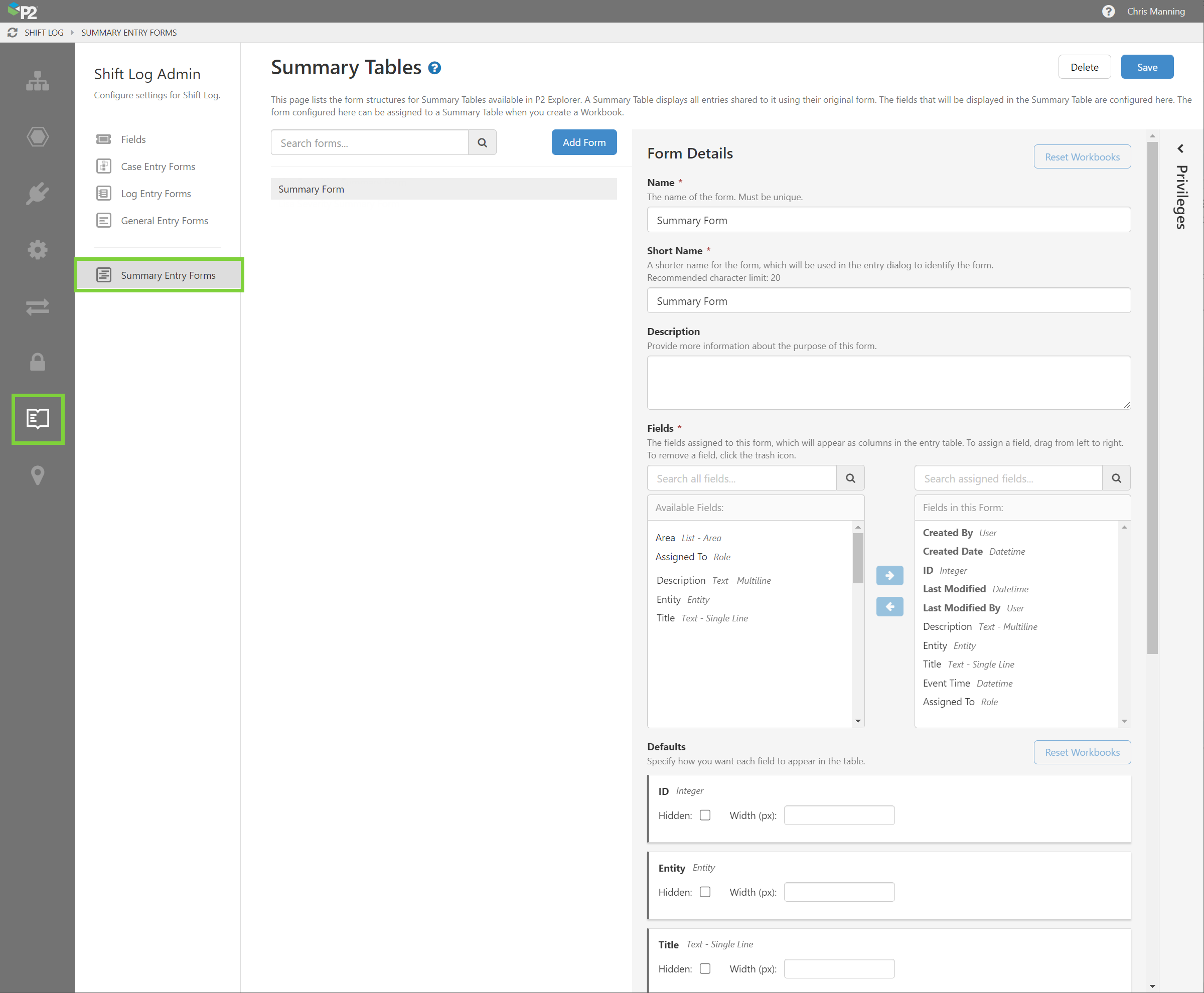 In P2 Server Management, Shift Log Admin has a new section for Summary Entry Forms, which users will share entries to. These forms are to be used in a summary workbook as the destination form.