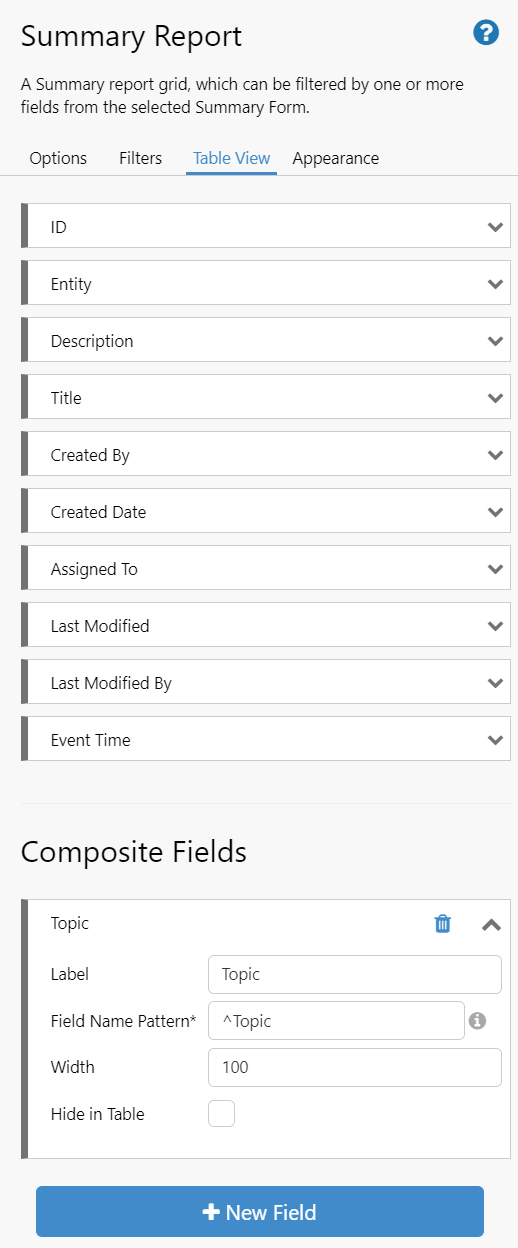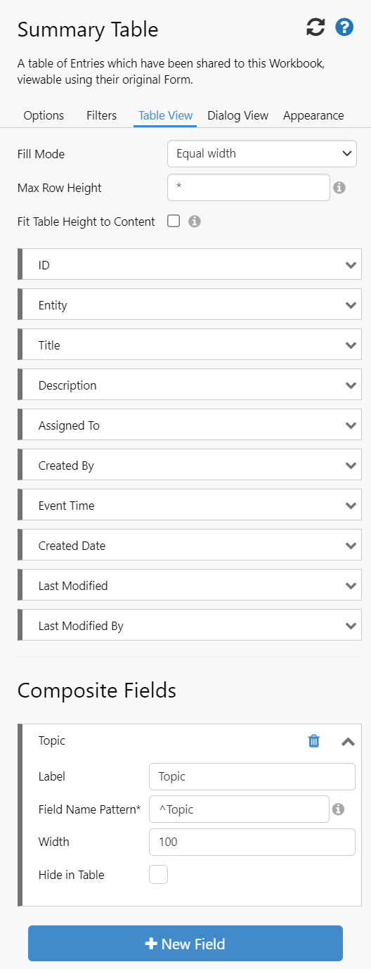In design mode, the page designer specifies which Summary Form to display entries for, and any filters needed. The fields that were added to the Summary Form can be seen in the Table View. These can be reordered and modified as normal. Below the form fields, you can also add Composite Fields. These are always displayed before the rest of the form fields.