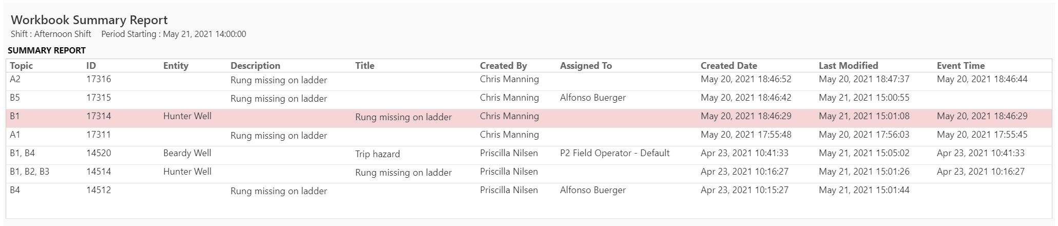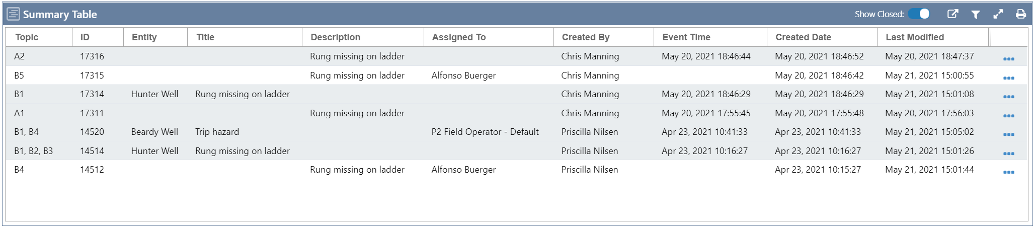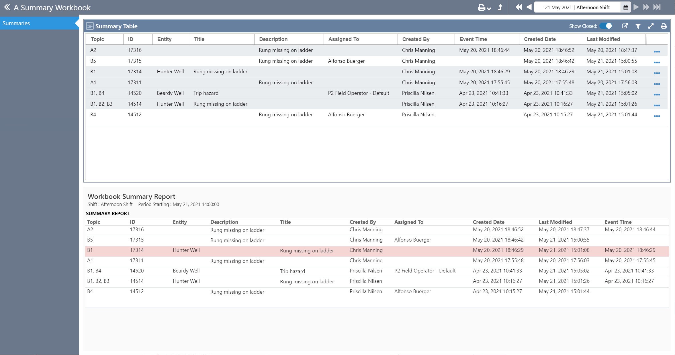 The Summary Report component is similar to other handover reports, except that it displays entries from a Summary Form. Like other handover reports, entries cannot be opened from here.