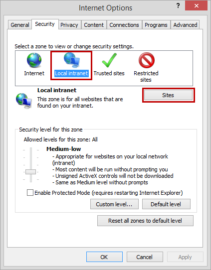 3. Click Local Intranet, and then click the Sites button.