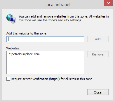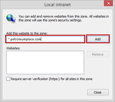5. In the Local intranet window, type the domain URL and then click the Add button.